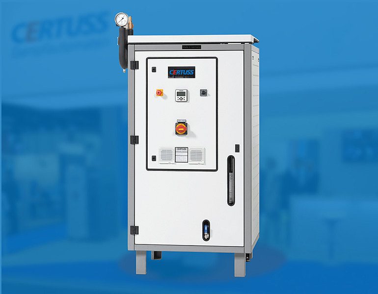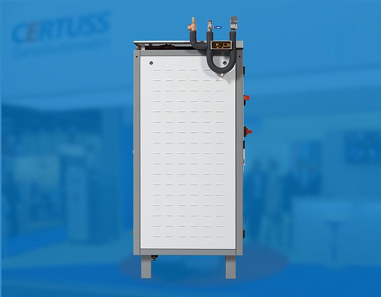 La instalación puede llevarse a cabo dentro de las instalaciones de producción y podemos ofrecer un conjunto de paquete trasero completo completo con ablandador de agua y recipiente de purga, que están pre-conectados / pre-cableados y probados en fábrica antes del envío al sitio. El generador de vapor eléctrico CERTUSS E 100 M – 120 M es una unidad compacta, fácil de operar, con control electrónico. Los datos se pueden transferir a BMS a través de contactos libres de voltaje.